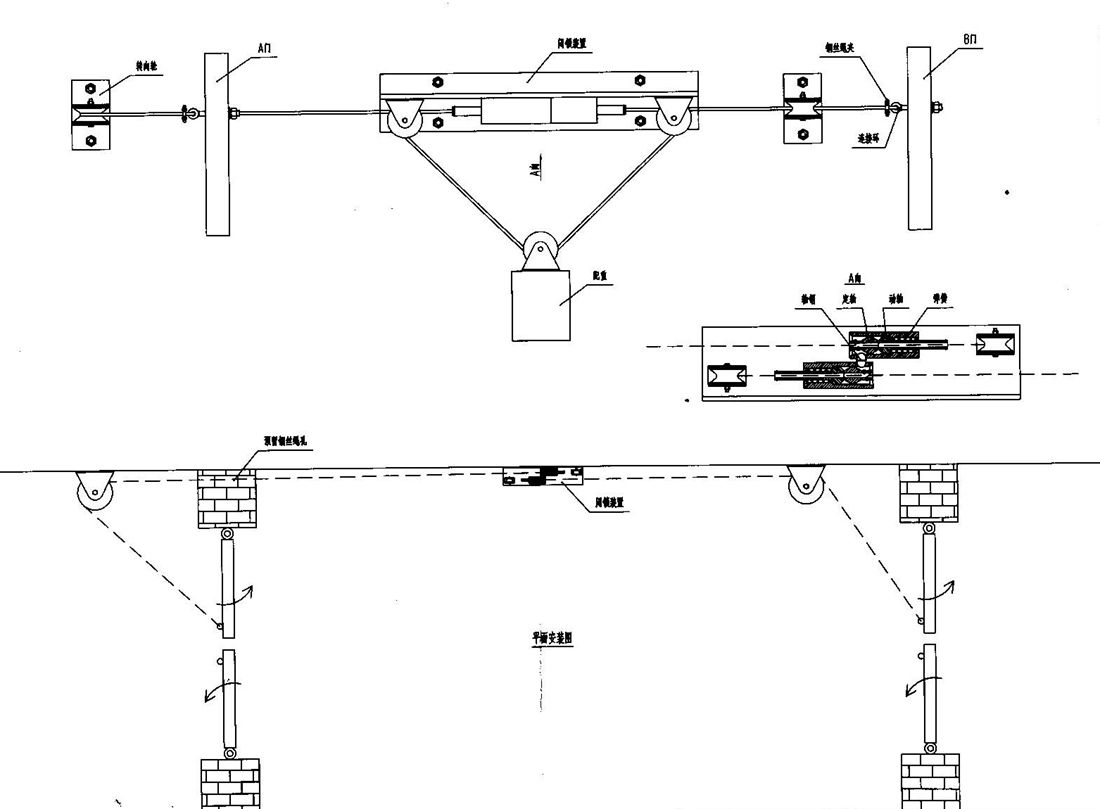 機械閉鎖裝置是怎么工作的呢?機械閉鎖裝置主要是用于兩道無壓風(fēng)門的,當(dāng)A門開啟時帶動鋼絲繩移動,固定在鋼絲繩上的定軸隨之移動,彈簧伸長將動軸頂起,動軸將軸銷推到另一側(cè),軸銷將與B門相連的鋼絲繩上的定軸固定,B門不能開啟。當(dāng)A門關(guān)閉時,配重帶動鋼絲繩向回移動,定軸將動軸壓回原位,軸銷可以移動,B門解鎖。同理,B門開啟時,A門也不能開啟。